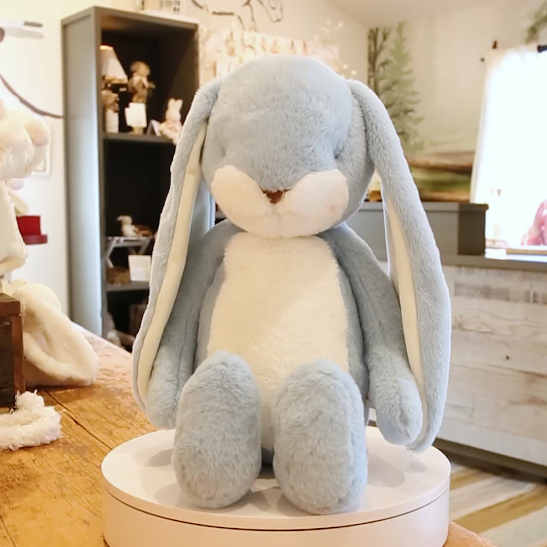 Luxurious Maui Blue nibble fur, warm white tummy, tail, inner ears, and muzzle. Quite possibly the best stuffed bunny rabbit in the world.