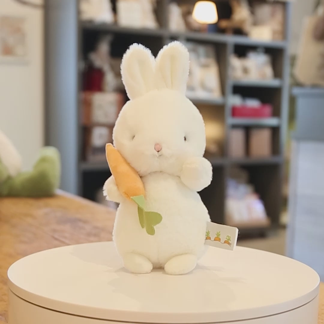 Sweet baby Bud follows everyone about, amongst the carrot tops he's a wee sprout! Soft white nibble fur with velour features. He clutches his favorite bright orange carrot treat, just ready to be nibbled.