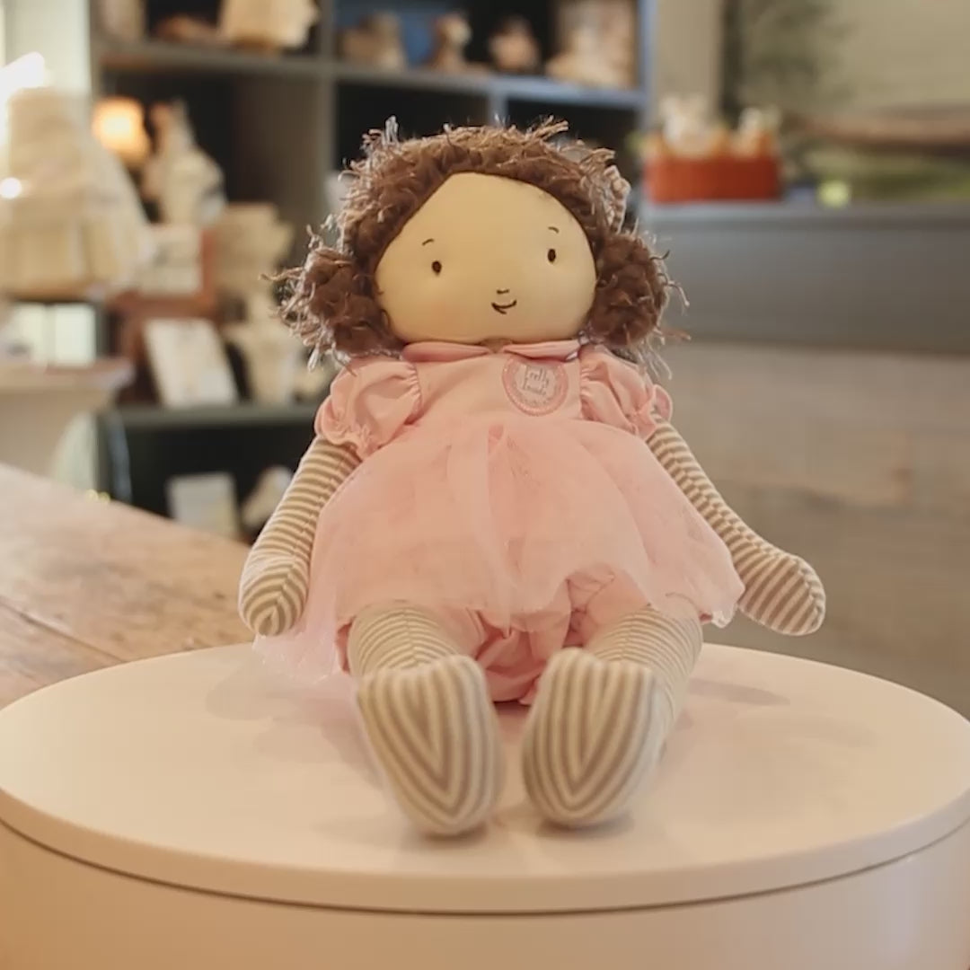 Pretty Inside patch stitched to her vintage pink blush cotton and tulle tutu dress. Soft knit grey and white striped body are perfect for toting around the house and cuddling up for Storytime. Vintage look makes for a timeless appeal, a perfect choice for a baby's first doll. Sure to be a treasured friend and keepsake for your little one.