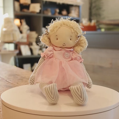 Pretty Inside patch stitched to her vintage pink blush cotton and tulle tutu dress. Soft knit grey and white striped body is perfect for toting around the house and cuddling up for Storytime. Vintage look makes for a timeless appeal, a perfect choice for baby's first doll. She comes with wee booklet and story of how Elsie learns through her friends that true beauty comes from within. Sure to be a treasured friend and keepsake for your little one.