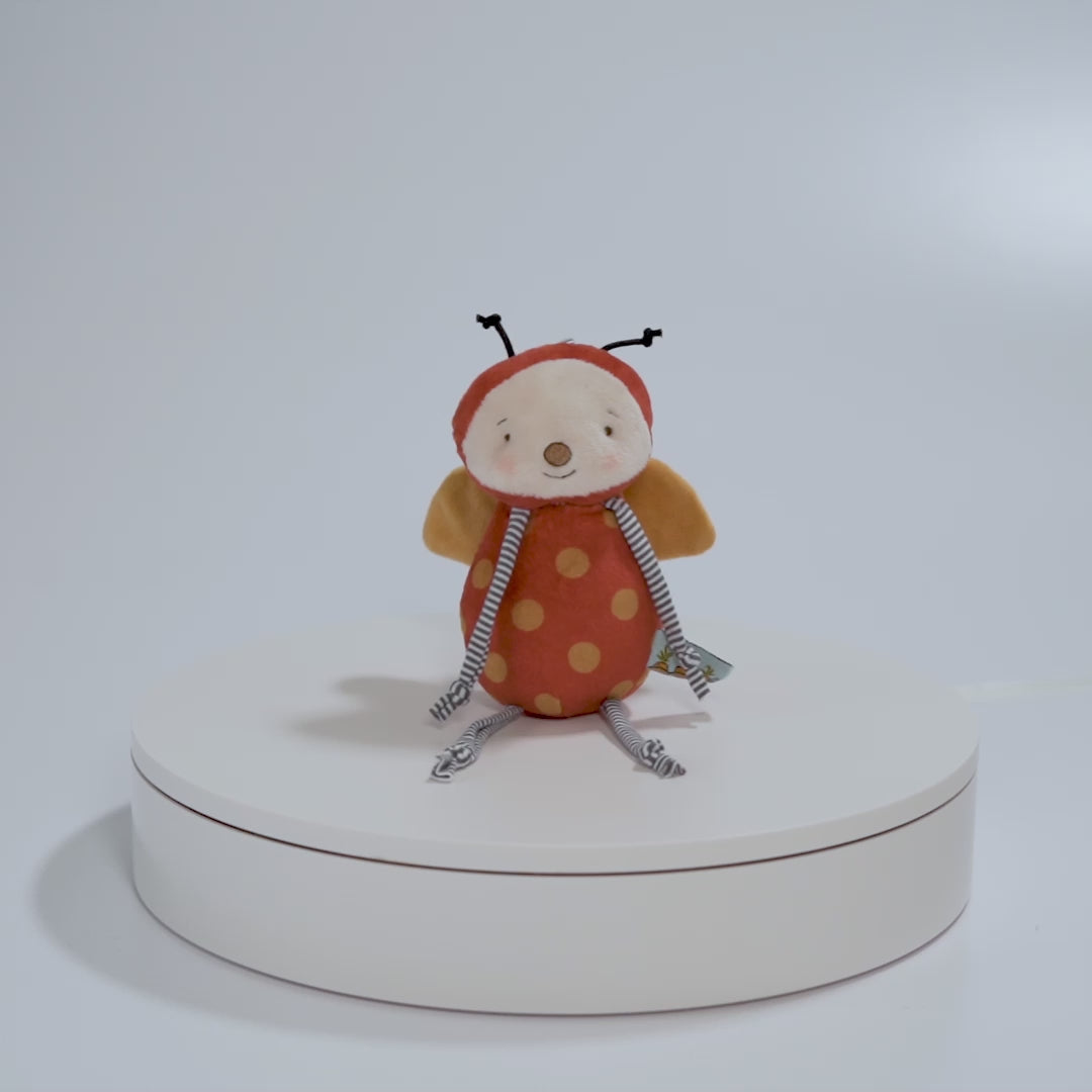 Soft red and orange velour, with knit dangly arms, legs, and antenna, and a Velcro loop for attaching to strollers and car seats this little bug is sure to become a treasured toy for your little one. Crinkle wings for sensory development, soothing, and play! The perfect take-a-long friend for a baby's car seat and stroller.