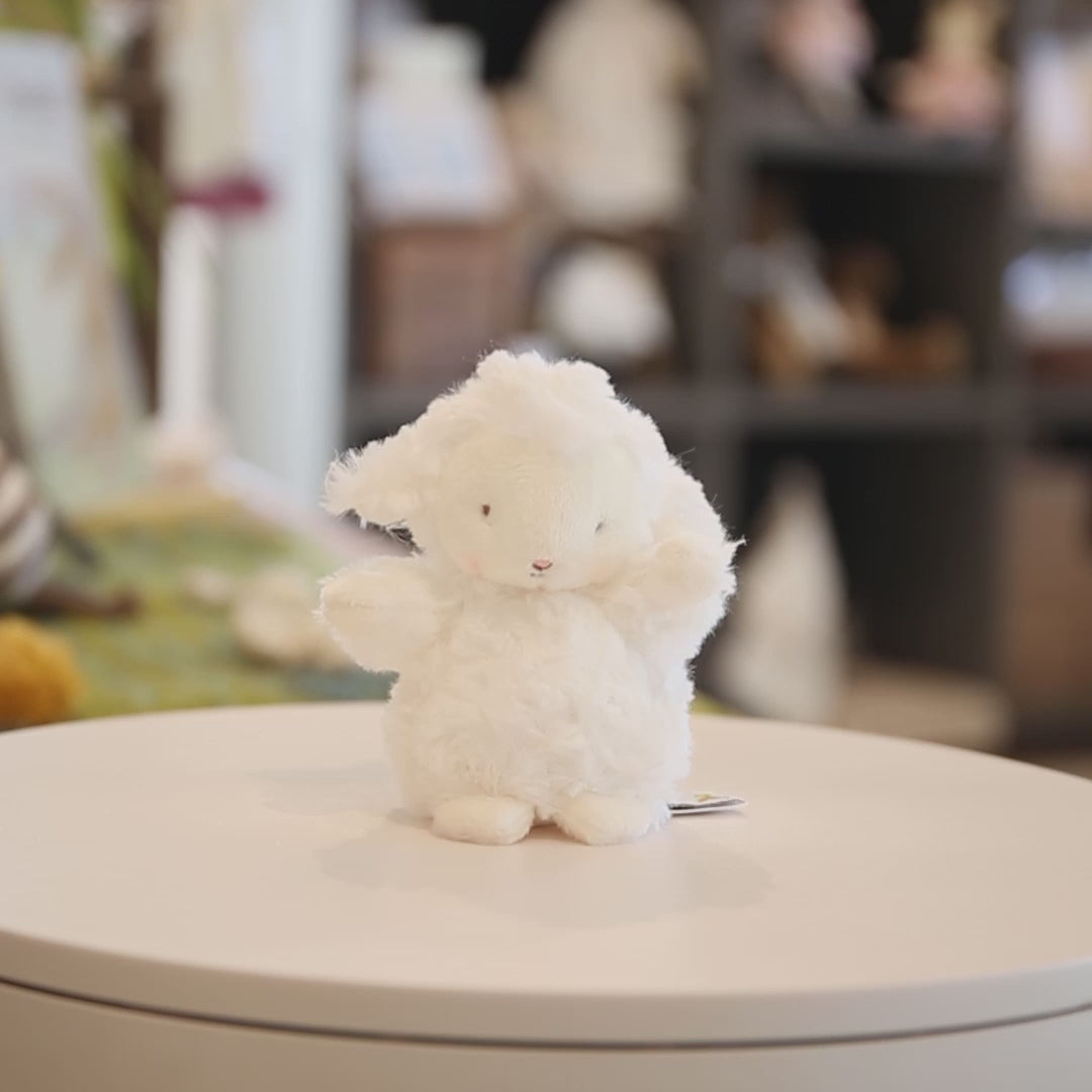 Wee Kiddo the Lamb, a charming plush bag charm! With soft white fur and adorable rosy cheeks, Wee Kiddo is the perfect pocket-sized pal for all your journeys. This sweet little lamb is ready to clip onto your keys, backpack, or purse, and spread a bit of delightful cheer wherever you go!