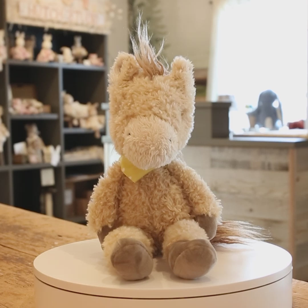 Pony Boy is ready to ride with some lucky little buckaroo. Tumbly wispy buckskin brown fur body with a cream muzzle and cocoa brown fur mane and tail. Bandana scarf about his neck in colorful curry with cream dots. Saddle up for some fun.