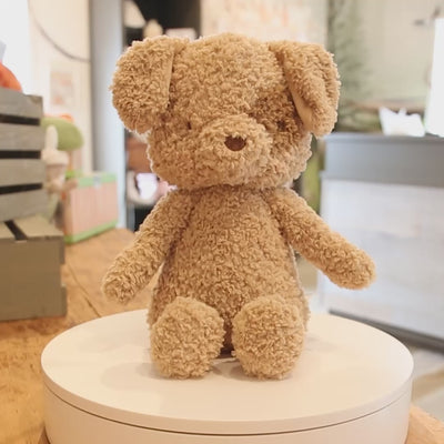 Rufus the Dog, a sweet and cuddly puppy stuffed animal made for cozy snuggles and story time moments. with warm toffee-brown fur, a charming chocolate patch over one eye, floppy ears and a sweet, curled tail, Rufus has a playful personality little ones will instantly love.