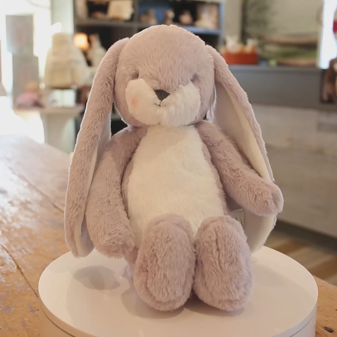 Sweet Nibble Bunny is sweet, tender and oh-my-gosh unbelievably soft, and now floppier than ever, and ready to be snuggled. This stuffed animal has a hand-embroidered face, pink cheeks, and big fluffy tail. Features lilac and warm white fur, with velour-lined ears. This plush bunny will become your best friend indeed.